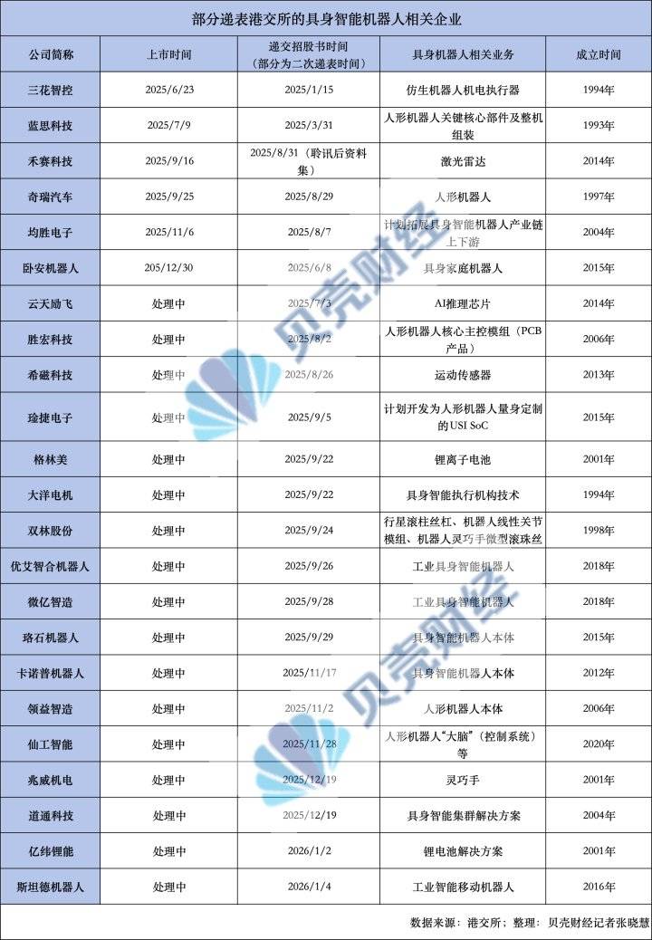 2025年12月30日,李泽湘参投的卧安机械人赶正在除夕跨大年夜前登岸港交所,为2025年机械人上市热画下句号的同时,也给2026年留下了更多的想象空间。2026年开年,斯坦德、亿纬锂能两家结构人形机械人赛道的企业先后递交招股书;死后列队的,还有胜宏科技、双林股份、兆威机电、仙工智能等十余家具身智能上下逛企业。据新京报贝壳财经记者不完全统计,2025年,共有跨越20家具身智能机械人上下逛企业递表港交所,根基集中鄙人半年。除少数几家曾经上市外,大都企业仍正在等待。这些企业中,既有专注人形机械人范畴的新兴力量,也不乏A股上市企业中的“跨界玩家”,如三花智控、蓝思科技、均胜电子、云天励飞等。有行业阐发师告诉贝壳财经记者,机械人行业热度正盛,因而“不少企业赶着上市,进行市值办理”。2025年被看做是“机械人量产元年”,企业铆脚劲拼量产和贸易化落地。2026年,跟着上下逛公司扎堆冲刺港股,具身智能机械人行业正在吸引更多市场关心的同时,也将持续面对盈利能力、手艺落地取市场所作等多沉。