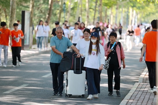 2024年9月,正在山东外国语职业手艺大学2024级重生报到期间,一重生家长送孩子入学。学校供图。