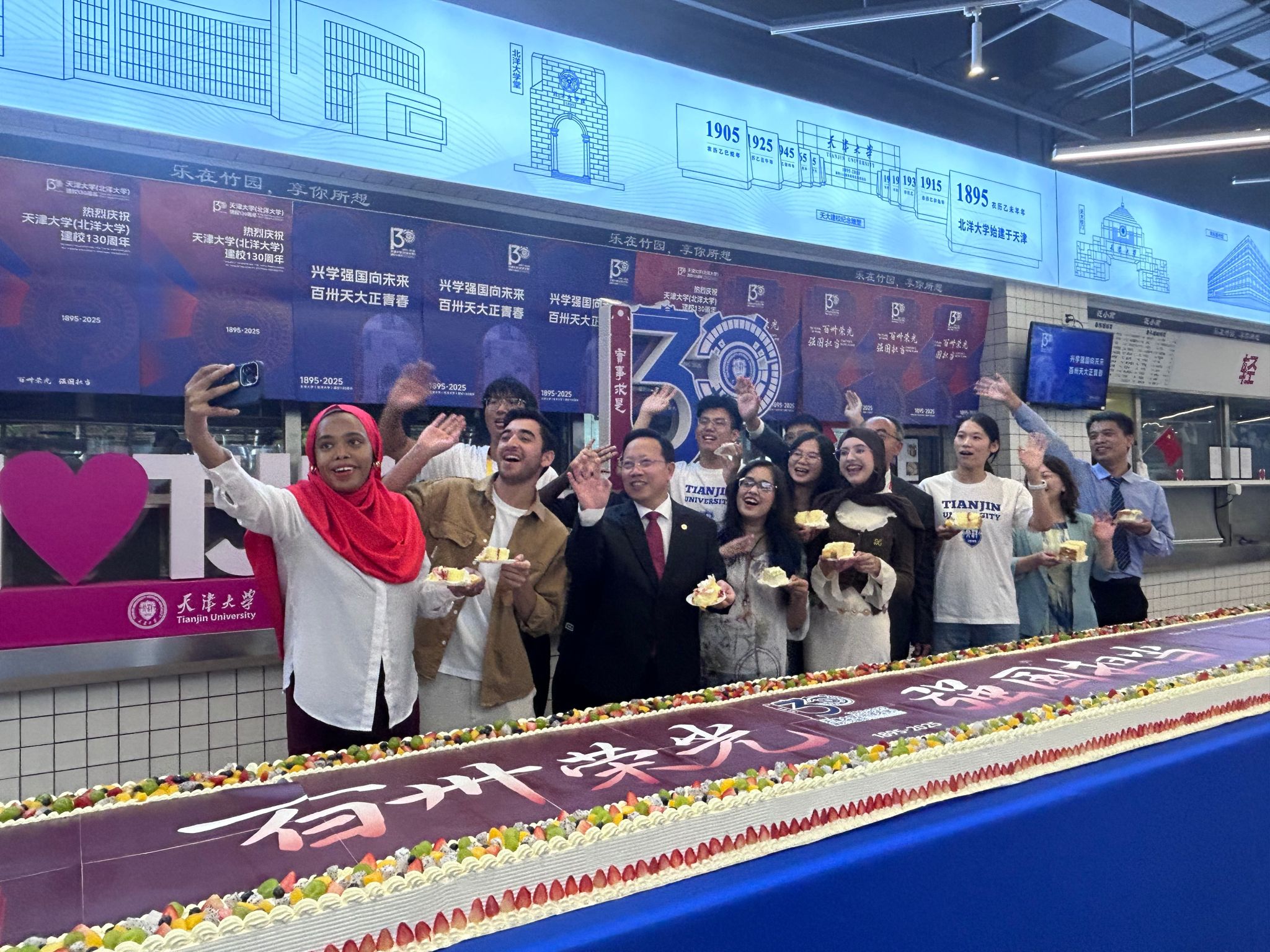 10月2日当天半夜12时,北洋园校区竹园餐厅内,一个巨型校庆华诞蛋糕方才做好。蛋糕长13米,宽80厘米,厚10厘米,用鲜花、各色生果和苦涩的巧克力粉饰,两头则是3D打印的校庆从题。除竹园餐厅的巨型蛋糕外,当天半夜双校区各食堂还预备了11个长1。3米的校庆蛋糕,供师生们一路分享母校华诞的喜悦。